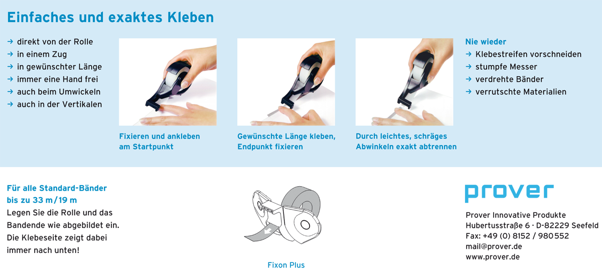 Der FIXON PLUS ist ein Klebefilmabroller für Standardbänder bis 25 m Länge. Die FIXON-Funktion ermöglicht Kleben und Schneiden direkt von der Rolle, in jeder Länge.